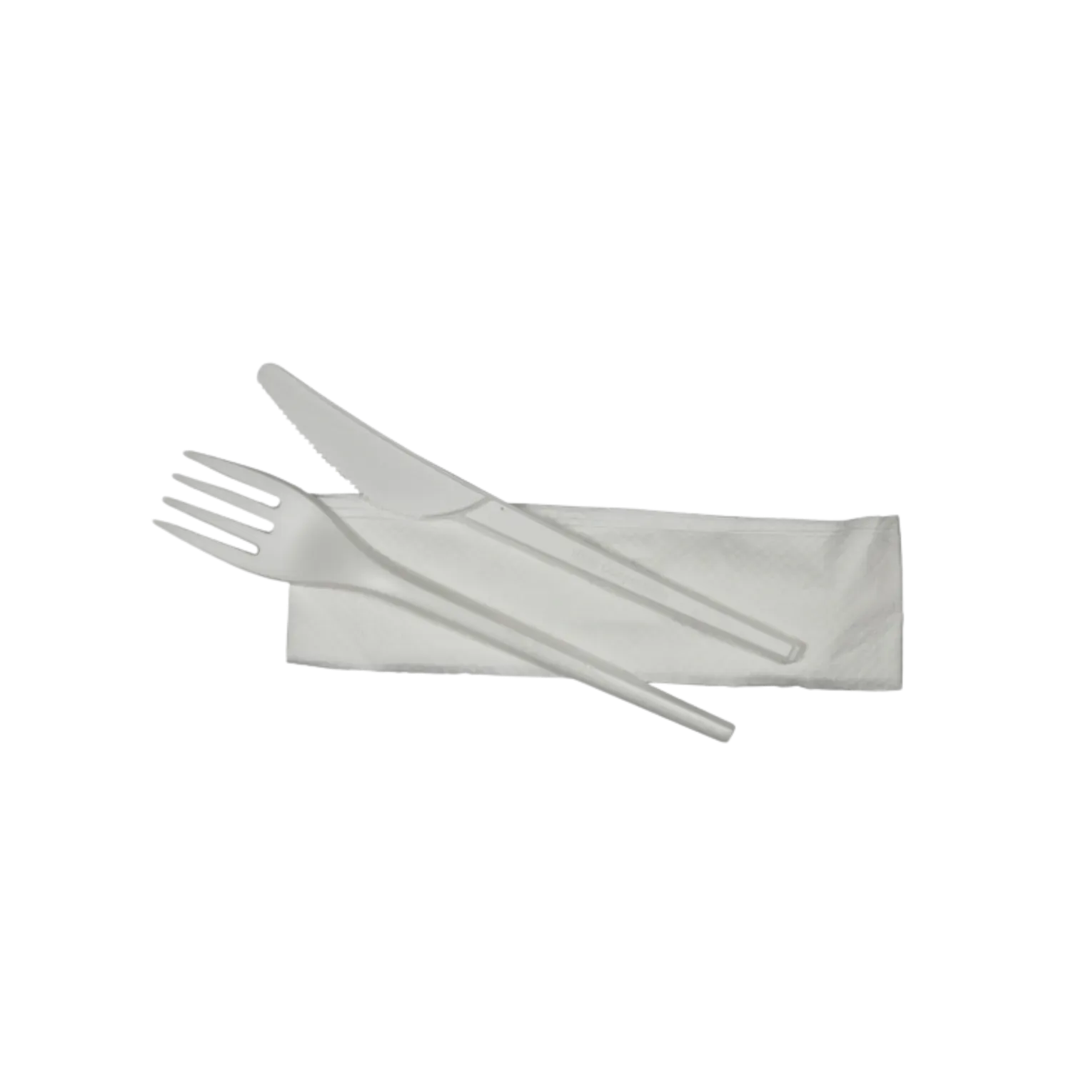 Diese Bestecksets aus CPLA enthalten Gabel, Messer und Serviette und sind ideal für das Servieren von Take-Away-Speisen geeignet.